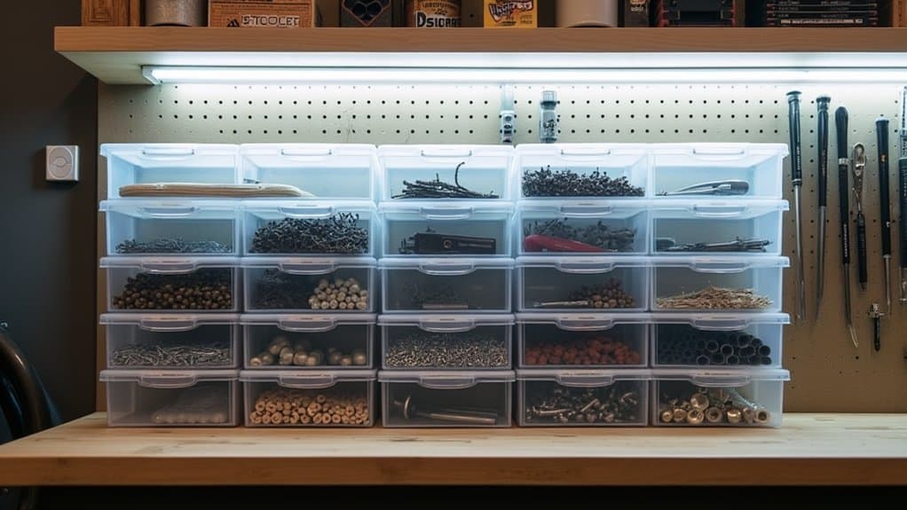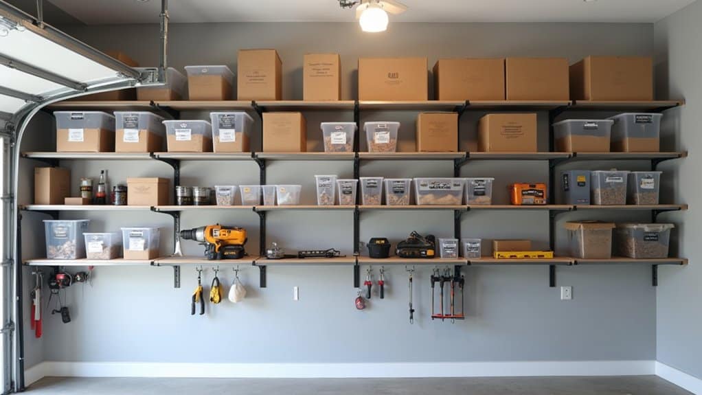 Labeling storage bins is a vital step in maintaining an organized garage, as it helps you quickly identify the contents without needing to open each container. Start by choosing clear, weather-resistant labels or a label maker that can withstand the garage environment, ensuring the text remains legible over time. Attach labels to the front or top of each bin for easy visibility, and consider using color-coded labels to categorize items like tools, seasonal decorations, or sports equipment.
