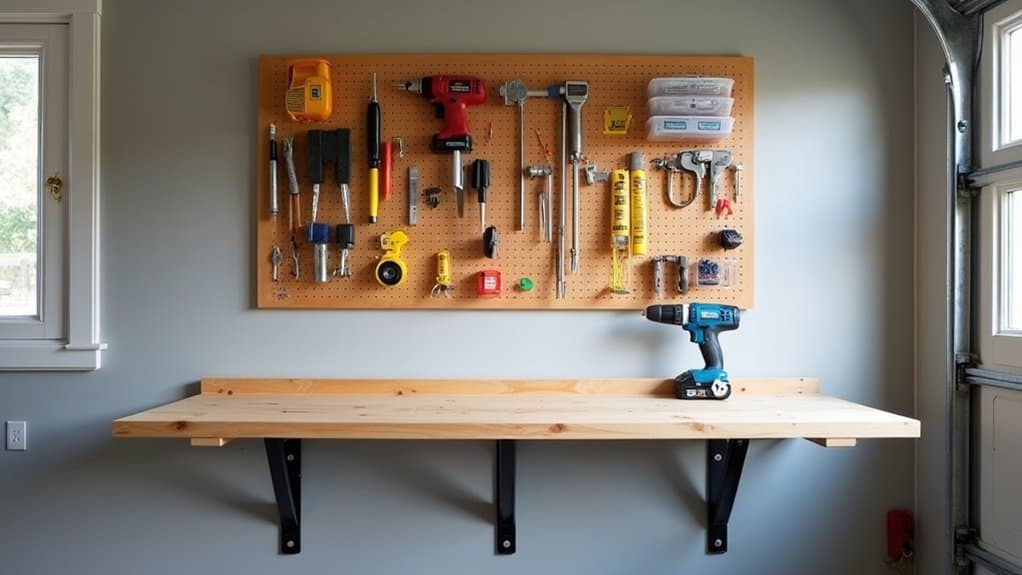 Once mounted, organize the workbench area by installing wall-mounted shelves or pegboards above it to store frequently used tools and supplies within arm’s reach. Keep the workbench surface clear by using small bins or drawer organizers for screws, nails, and other small items. This setup maximizes space efficiency, allowing you to fold the workbench away and reclaim floor space for other garage activities when needed.