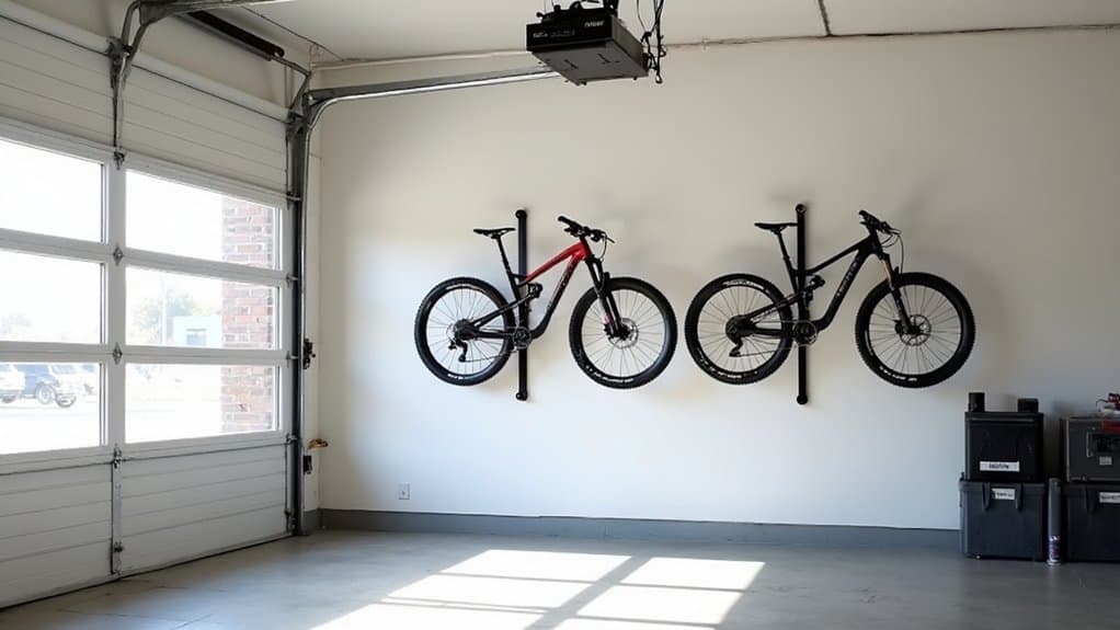 Creating vertical bike storage in your garage is an excellent way to save floor space and keep your bikes easily accessible. Start by installing wall-mounted bike racks or hooks, which can hold bikes upright against the wall, freeing up valuable ground space for other items. Verify the racks or hooks are securely anchored into wall studs to support the weight of the bikes and prevent damage to the wall.