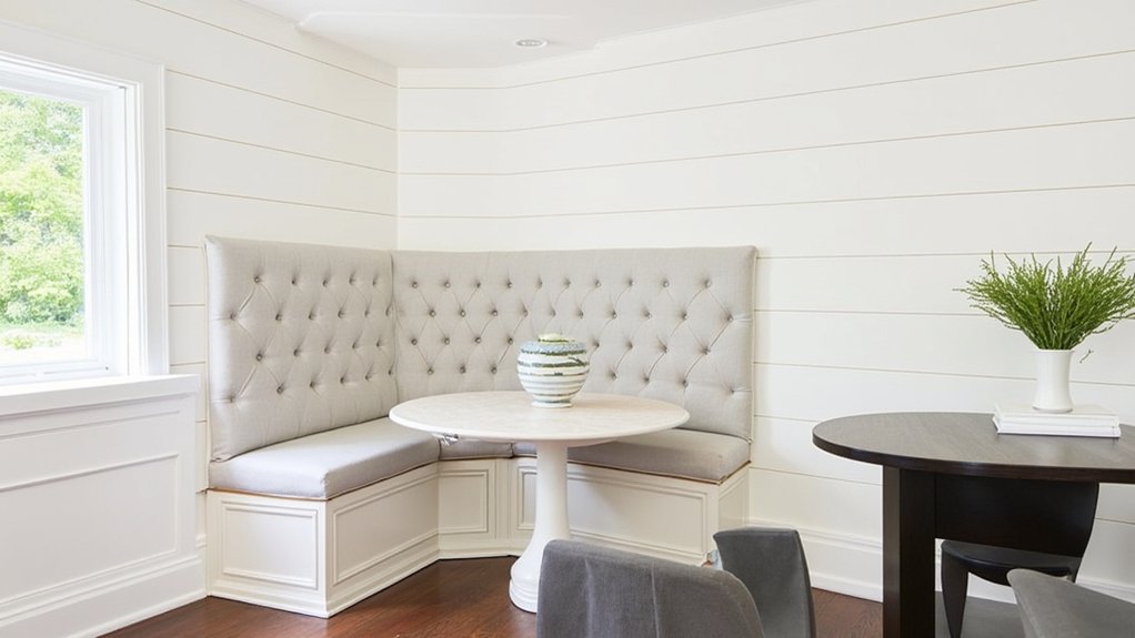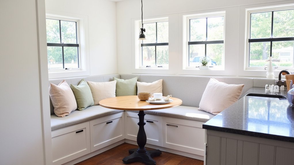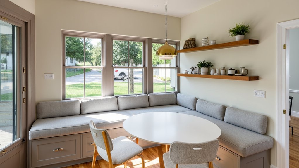 As you rethink your kitchen layout, consider a space-saving banquette design to boost seating without crowding the room. It’s a smart way to tuck seating into corners or along walls, maximizing every inch.