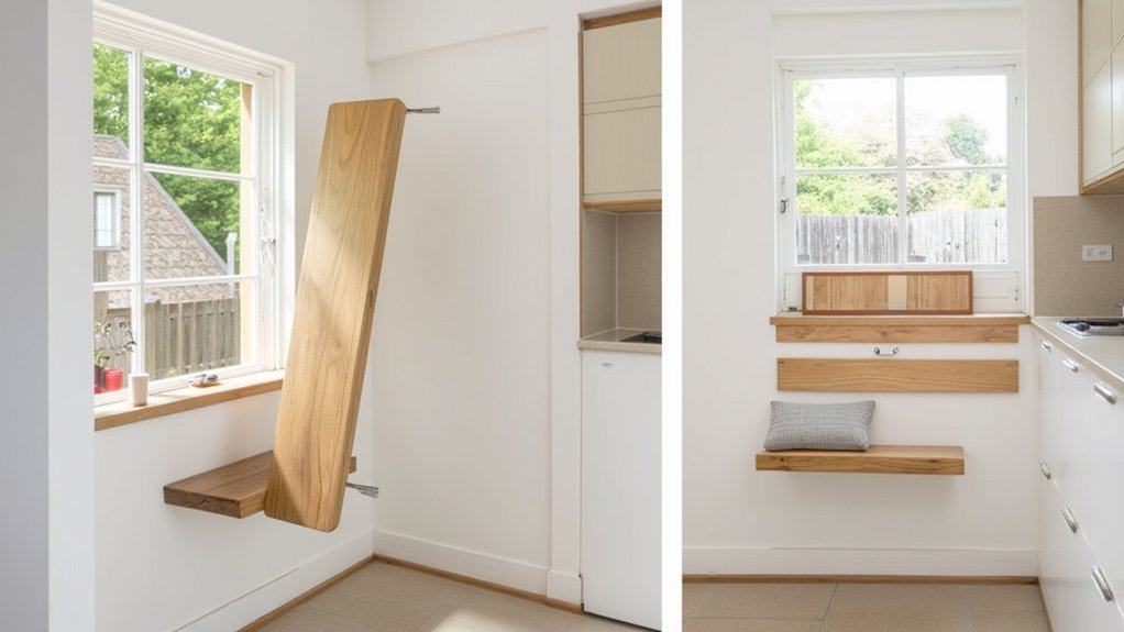 Many homeowners find foldable wall-mounted seats a fantastic choice for maximizing tiny kitchen spaces. You can install these clever seats to save floor area when they’re not in use. They’re perfect for quick meals or extra seating during gatherings.