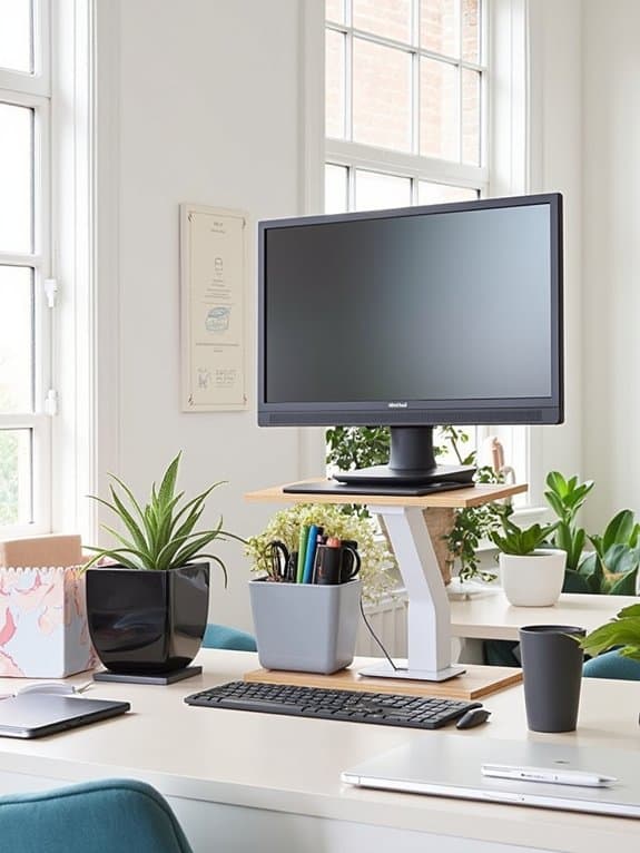 Using a monitor riser stand helps maintain proper ergonomic posture at your desk and prevents neck strain during extended computer use. The stand elevates your screen to eye level, keeping your neck in a neutral position while working.
