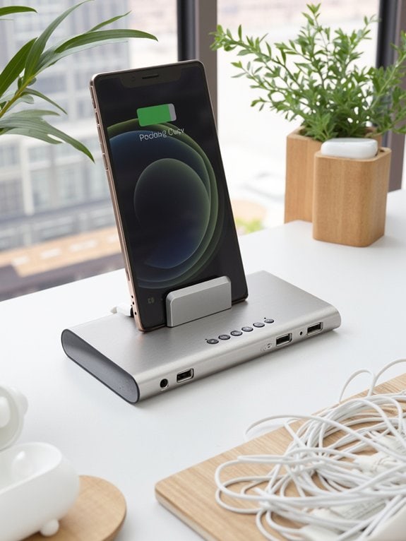 A desktop charging station hub consolidates power management into a single organized unit, eliminating the tangle of cables that typically clutters workspaces. By providing multiple charging options including wireless pads and USB ports, the hub efficiently powers smartphones, tablets, and other electronic devices from one central location.