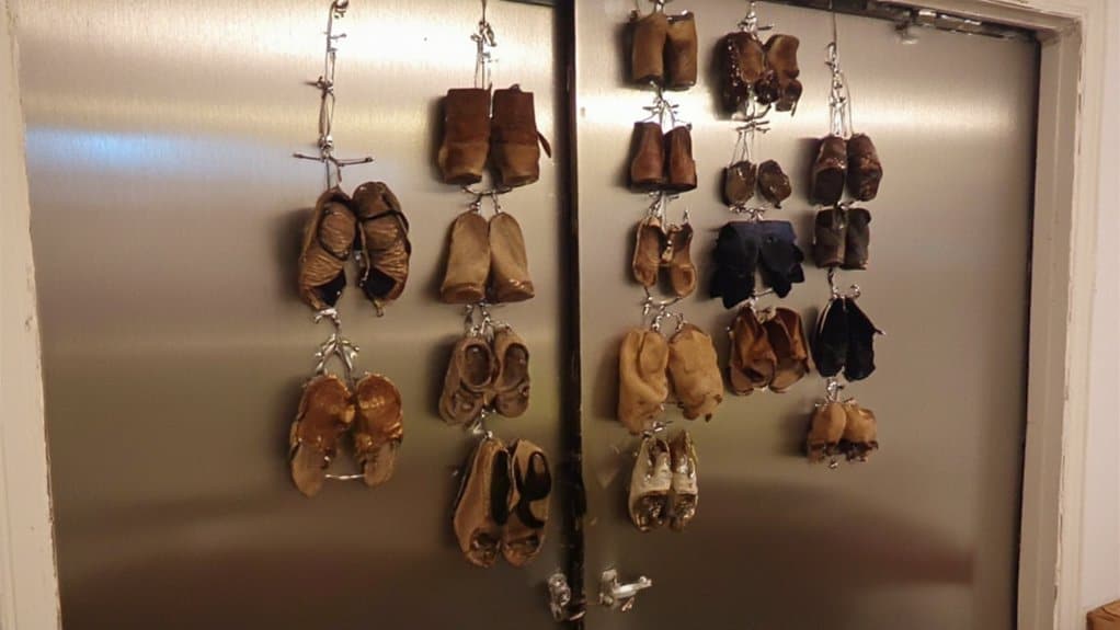Installation is straightforward—simply attach the magnetic holders to the metal surface and place your shoes inside, pairing them neatly to maximize space. For ideal organization, arrange shoes by frequency of use or type, placing everyday pairs at eye level for quick access. If your closet lacks metal surfaces, consider adding a magnetic strip or panel to adapt this method, ensuring versatility in small or crowded spaces.