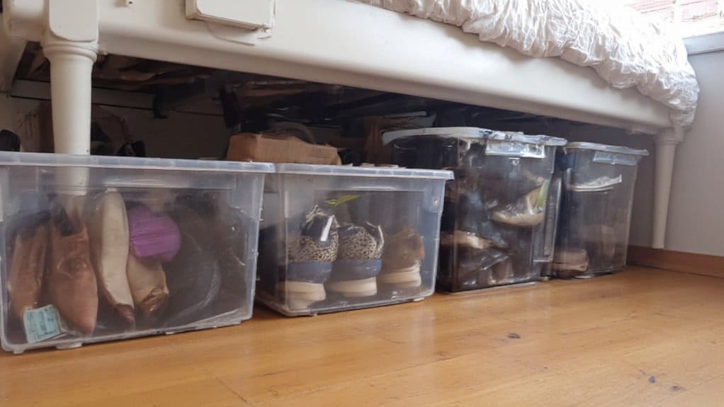 To maximize efficiency, categorize your shoes by type or season before placing them in the storage units, assuring frequently used pairs are easily accessible. Arrange the containers under the bed in a way that allows you to pull them out effortlessly, such as using rolling storage for added convenience. This method not only frees up closet space but also keeps your shoes organized and out of sight.