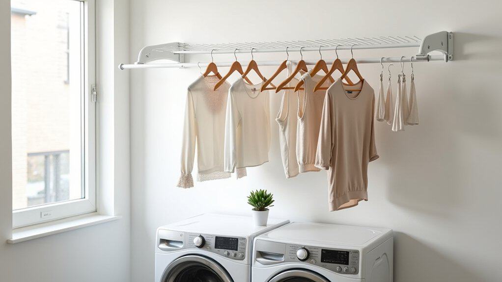 When organizing your hang drying rack, prioritize items by drying time and delicacy, hanging heavier or thicker fabrics on lower rungs or sturdier sections for stability. Leave space between items to allow air circulation, which helps prevent musty odors and speeds up drying. Regularly clean the rack to remove dust or lint buildup, ensuring it remains a hygienic drying solution for your laundry.