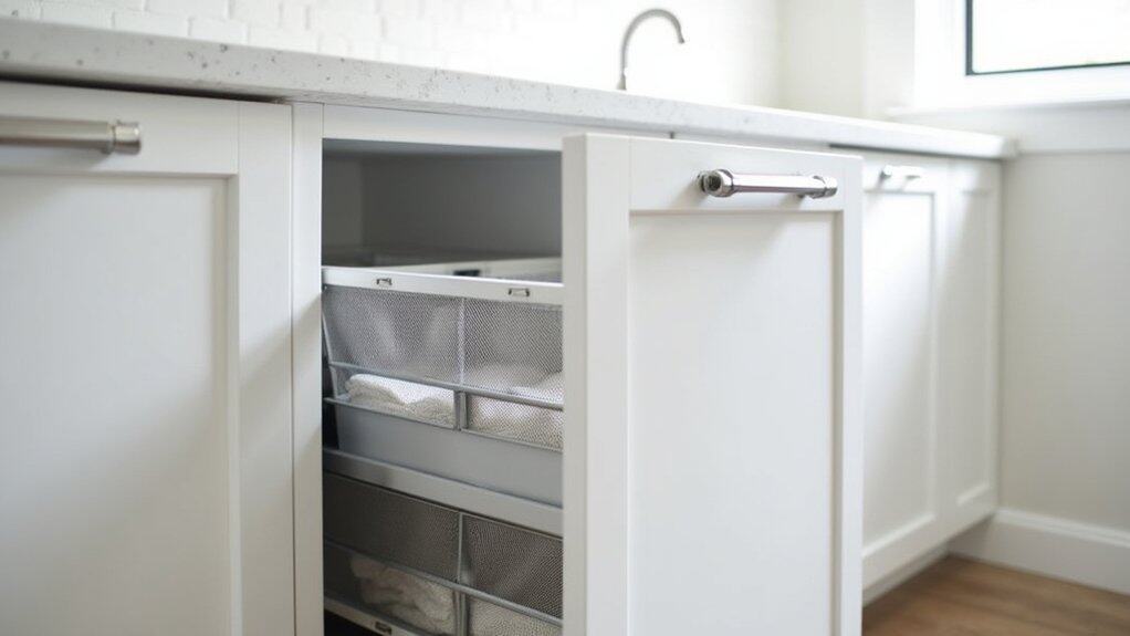 Installing pull-out hampers in your laundry room is a practical way to keep dirty clothes out of sight while maximizing space efficiency. Start by measuring the dimensions of your cabinets or designated area to guarantee the hamper fits seamlessly, and choose a model with a sturdy frame and smooth gliding mechanism for easy access. Many pull-out hampers come with removable bins, making it simple to sort laundry by color or fabric type as you go.