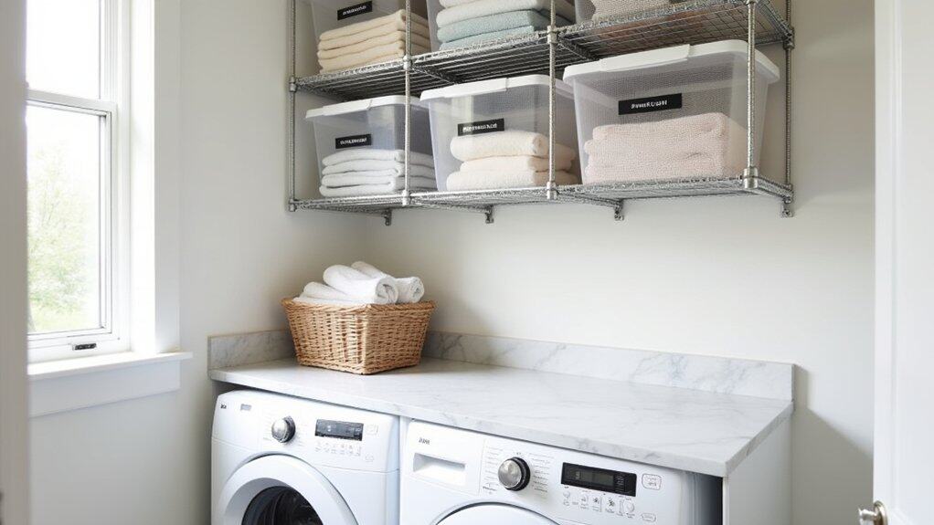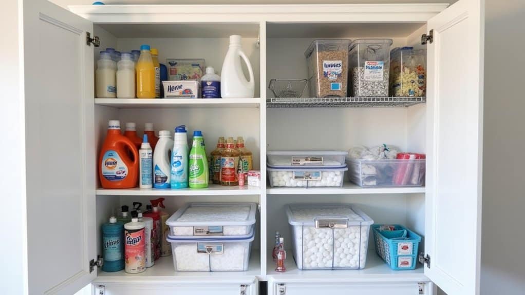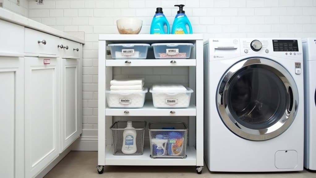 When organizing, place frequently used items like detergent and fabric softener on the most accessible shelves, while storing less-used supplies, such as extra cleaning products or seasonal items, on higher or lower levels. Ascertain the unit is stable by securing it to the wall if necessary, and consider using labeled bins or baskets to keep smaller items contained and easy to find. This approach not only frees up floor space but also creates a neat, functional setup for your laundry routine.