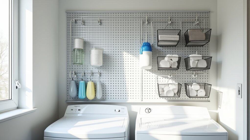 Once the pegboard is mounted, customize it with a variety of hooks, baskets, and shelves to store items like detergent bottles, dryer sheets, and cleaning tools. Arrange frequently used items at eye level for convenience, and use labeled bins or containers for smaller objects to maintain a tidy look. This versatile storage solution not only saves space but also keeps your laundry room organized and functional.
