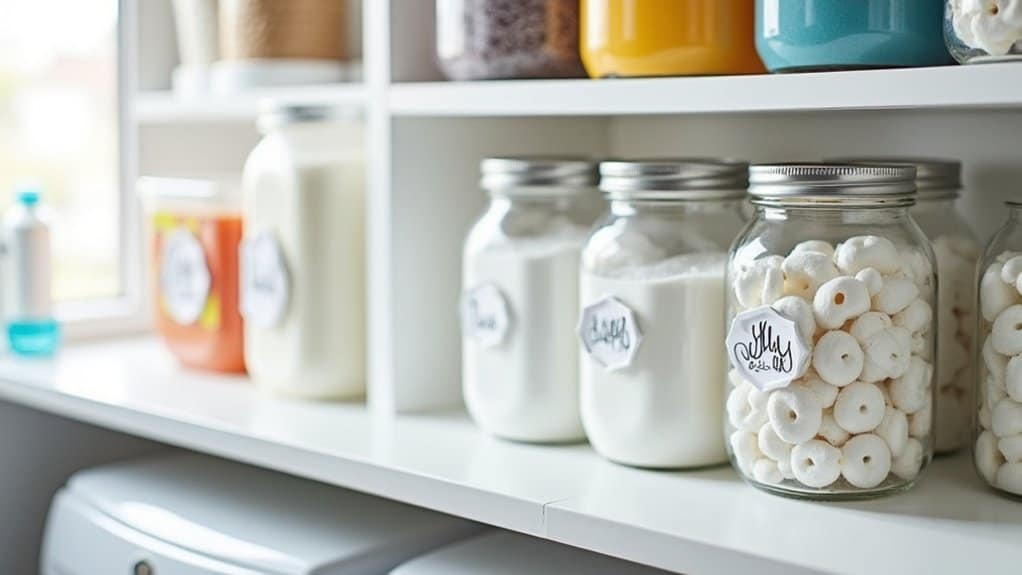 Labeling Labeling detergent containers is a simple yet effective way to keep your laundry room organized and efficient. Start by identifying all the detergent types you use, such as liquid, powder, or pods, and guarantee each has a clearly designated container or area. Use waterproof labels or permanent markers to write the contents on each container, making it easy to grab the right product without guesswork.