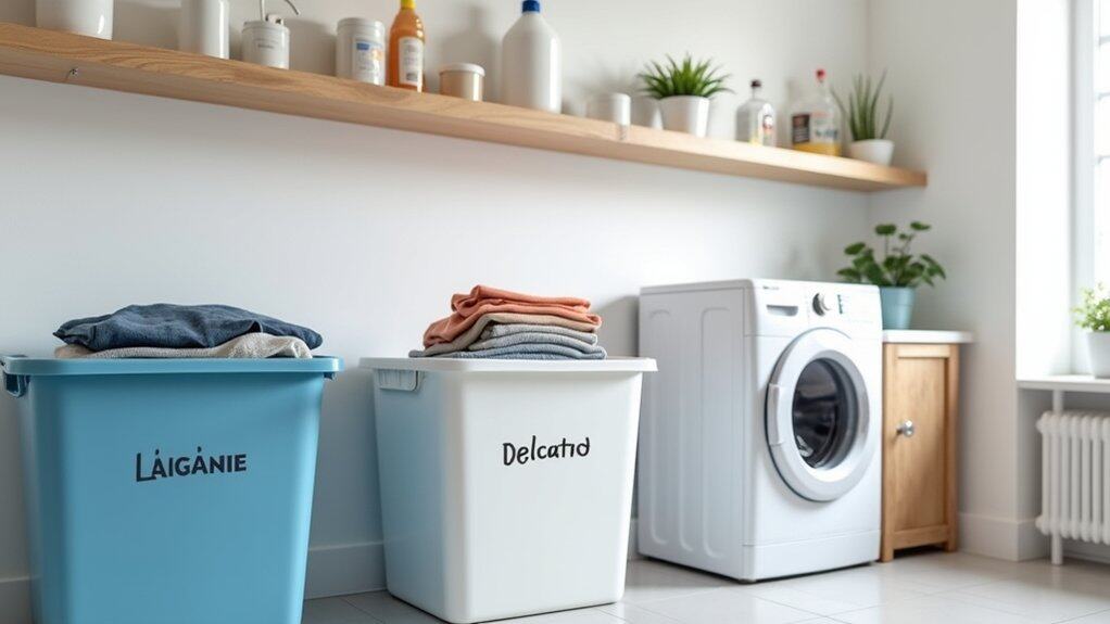 To maximize efficiency, consider using stackable or rolling bins to save space in smaller laundry rooms. Encourage family members to sort their clothes as they go, reducing the need for a big sorting session on laundry day. This simple system not only keeps the area tidy but also helps guarantee that clothes are washed with the right settings and care.
