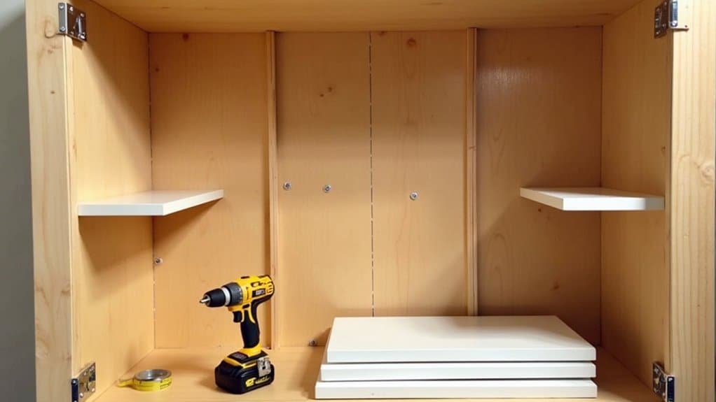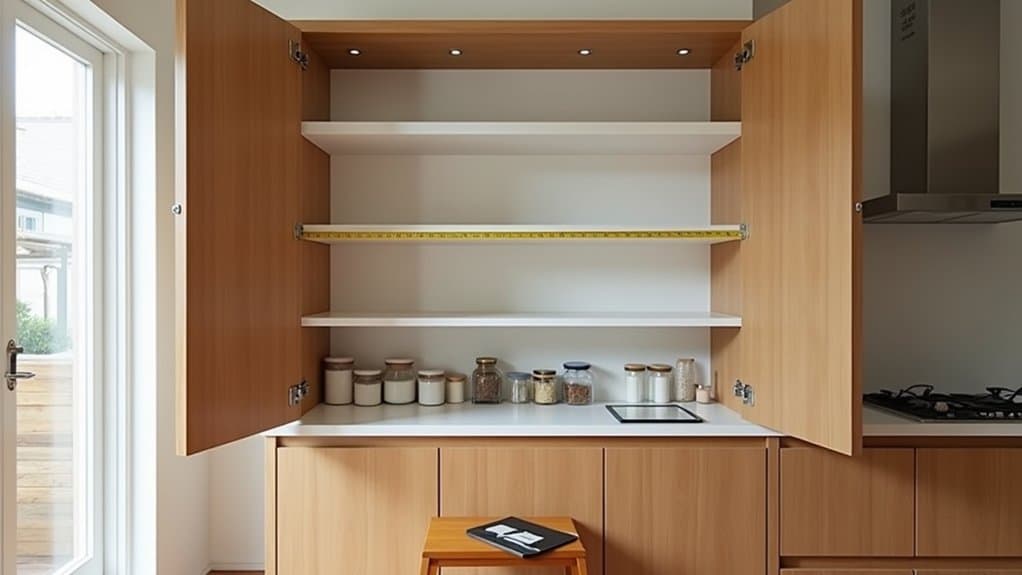 To install, measure and mark the desired shelf heights on the cabinet walls, ensuring they are level to prevent items from tipping. Use a drill to secure the brackets or shelf supports at the marked spots, following the manufacturer’s instructions for proper alignment. Once the shelves are in place, organize your pantry items by grouping similar products together and placing frequently used items at eye level for easy access. Regularly revisit the shelf heights to adjust them as necessary, keeping your pantry functional and clutter-free.