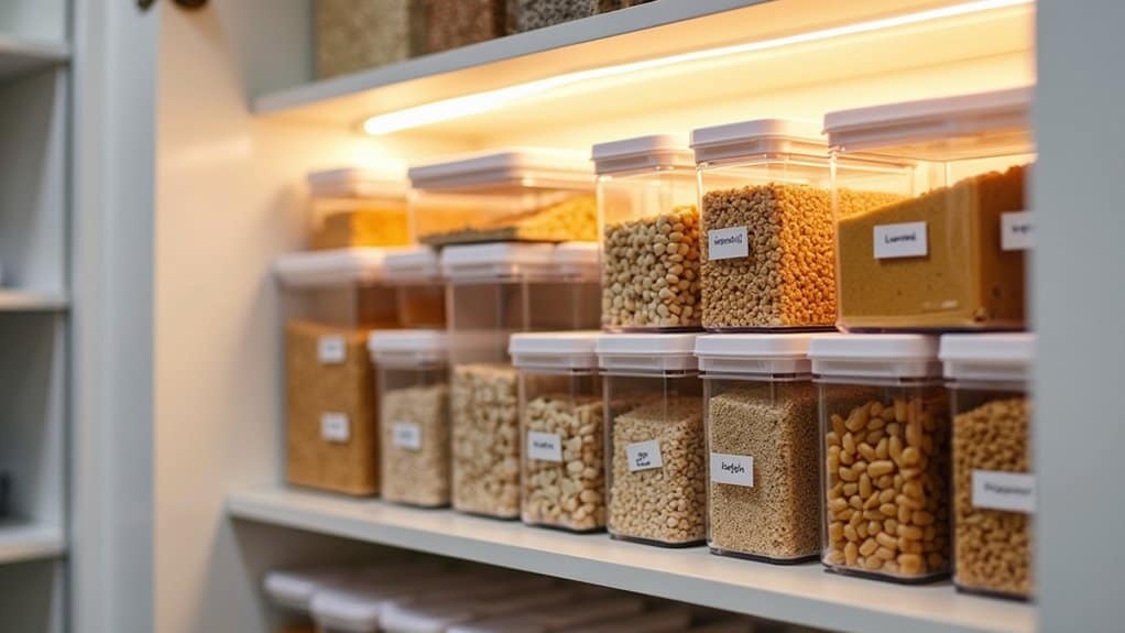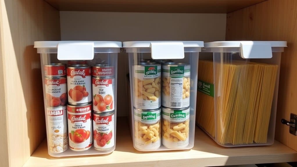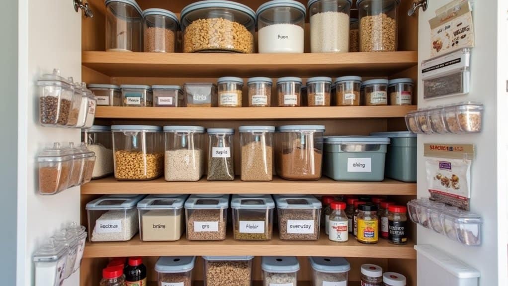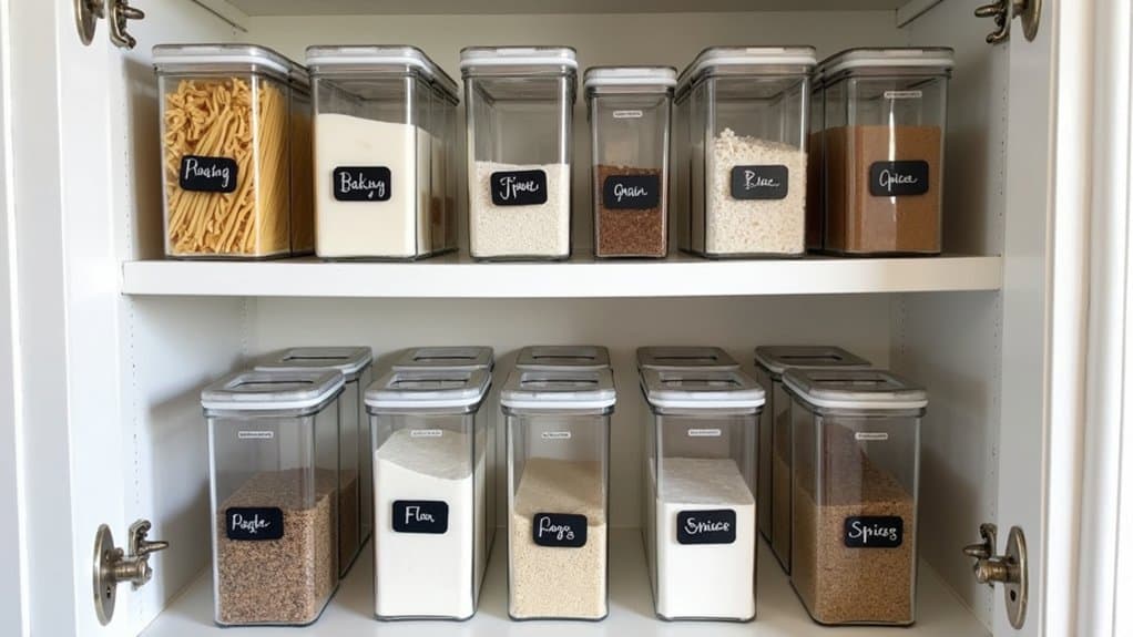 Incorporating clear containers into small cabinet pantries is a game-changer for maintaining order and maximizing space. These containers allow you to see contents at a glance, eliminating the need to rummage through packages or guess what’s inside. Start by sorting pantry items into categories like grains, snacks, or baking supplies, then transfer them into appropriately sized clear containers with airtight lids to keep food fresh. Label each container clearly with the item name and, if desired, the expiration date to guarantee nothing goes to waste.