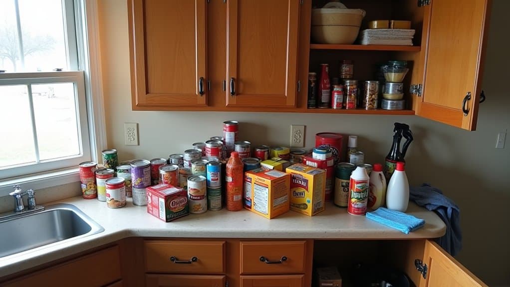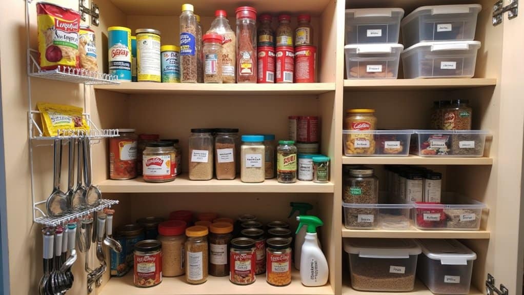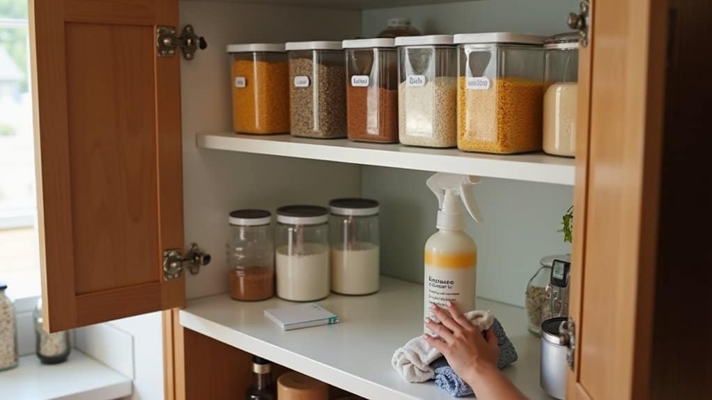 Additionally, involve household members in the process by assigning simple tasks like rotating stock or noting items that need restocking on a shared list. Keeping a small inventory or labeling system updated during upkeep guarantees everyone knows where things belong. Address spills or messes immediately to avoid sticky residues or pest attractions, which can quickly turn a small pantry into a problem area. Regular upkeep not only keeps your space tidy but also saves time and reduces stress when preparing meals.