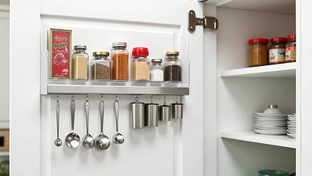 For a customized solution, consider installing hooks or magnetic strips on the door’s interior to hang measuring spoons, oven mitts, or even small metal containers for storage. Make certain to measure the door’s dimensions and the clearance space to avoid obstructing shelves when the door closes. Opt for lightweight materials to avoid straining the door hinges over time. This method not only declutters the pantry but also adds a functional layer to an otherwise unused area.