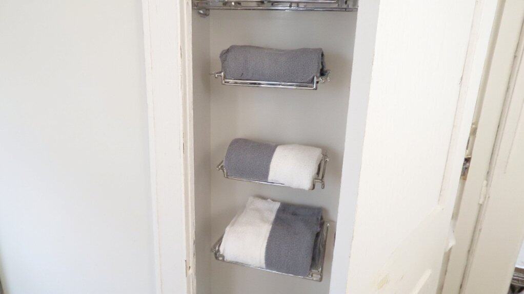 Vertical towel racks are an excellent solution for maximizing space in a towel closet, especially if you’re dealing with a small or narrow area. By installing racks on the inside of the closet door or along the walls, you can store multiple towels without taking up valuable shelf or floor space. Confirm the racks are sturdy and properly mounted to handle the weight of folded or rolled towels for a neat and accessible arrangement.