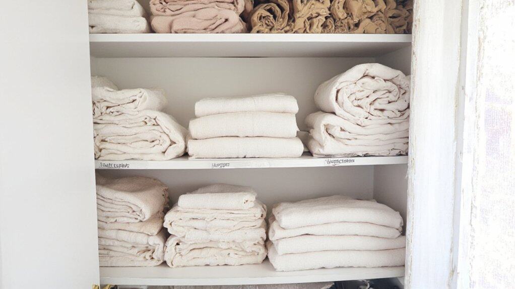To create labels, you can use a label maker for a polished look, or simply print labels on cardstock and laminate them for durability. Place the labels consistently on each shelf, guaranteeing they are visible even when the shelves are full. This small step not only enhances the organization of your towel closet but also saves time by eliminating the need to search for the right towel.
