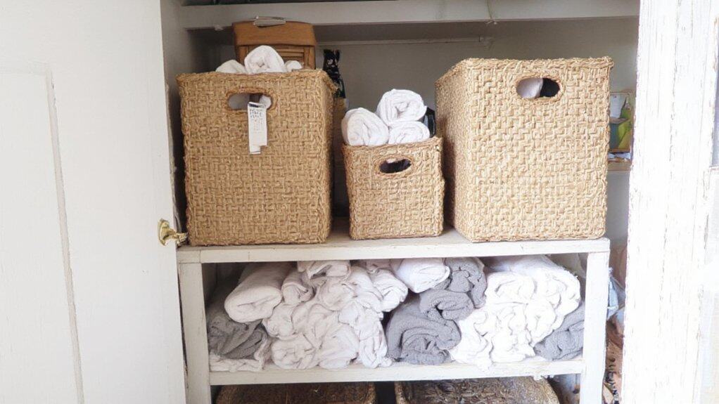 Installing sliding baskets in your towel closet is a practical way to maximize storage space and keep items easily accessible. These baskets glide out smoothly, allowing you to store towels, washcloths, and other linens in a neat, organized manner without having to rummage through stacks. To begin, measure the dimensions of your closet shelves to guarantee you purchase baskets that fit properly, and opt for durable, lightweight materials like wire or plastic for easy handling.