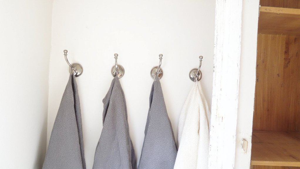 To install the hooks, use a drill or adhesive strips, depending on the surface and weight capacity, and make sure they are evenly spaced for a neat appearance. Label each hook if you share the closet with family members to designate specific towels for each person, preventing mix-ups. This simple addition not only frees up shelf space for other linens but also adds a functional and visually appealing element to your towel closet organization.