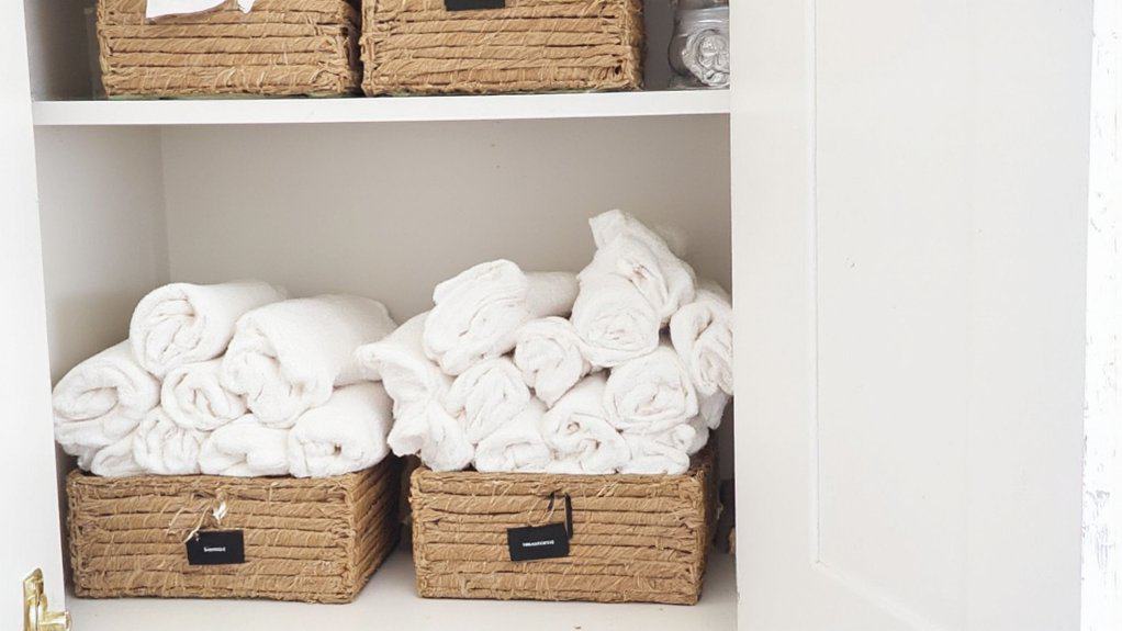 Start by folding or rolling your towels uniformly to guarantee they stack neatly inside the bins, which also makes the closet look tidy. Place the most frequently used towels in easily accessible bins at eye level, while seasonal or guest towels can go in higher or lower bins. Regularly rotate and check the bins to keep towels fresh and avoid overcrowding, making sure the system remains functional over time.