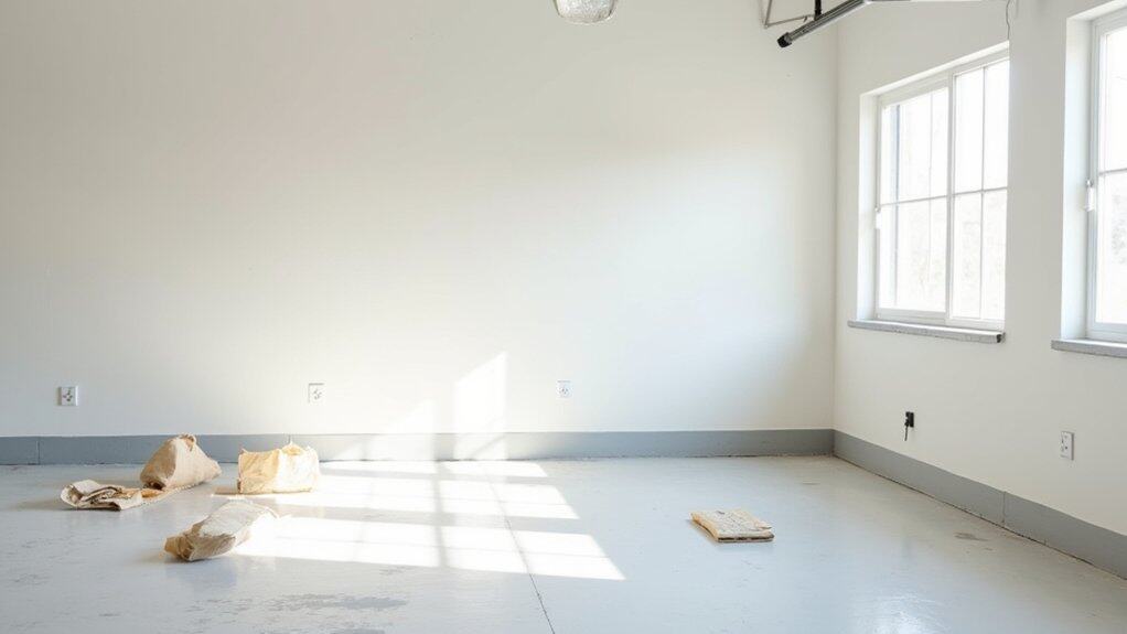 Begin by protecting the floor and any items in the garage with drop cloths or plastic sheeting to avoid paint splatters. Use a high-quality primer if the walls are dark or stained to guarantee even coverage, then apply at least two coats of your chosen light-colored paint for the best results. Take care to paint evenly, using a roller for larger areas and a brush for edges and corners, to enhance the overall brightness and spacious feel of the garage.