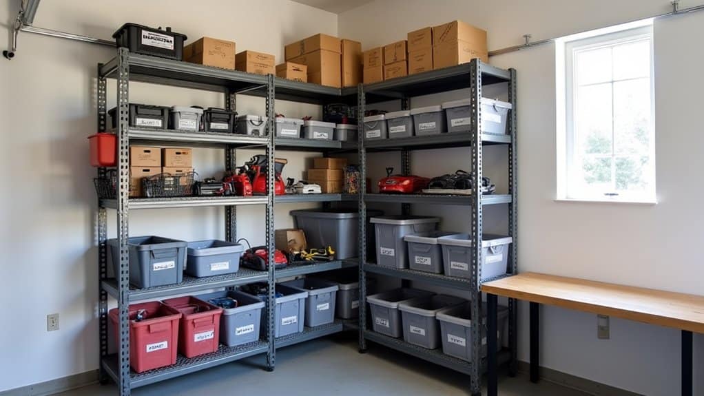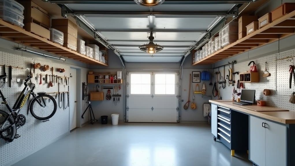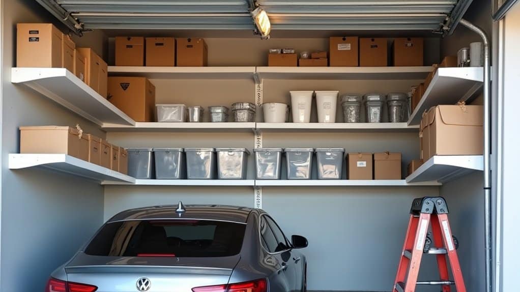 Installing overhead shelves in a one-car garage is a smart way to maximize vertical space and keep the floor clear for parking or other activities. Start by measuring the available ceiling space and selecting sturdy, adjustable shelving units designed for overhead installation, guaranteeing they can support the weight of items you plan to store. Secure the shelves to ceiling joists or use heavy-duty anchors for a stable setup, and always check the weight capacity to avoid overloading.