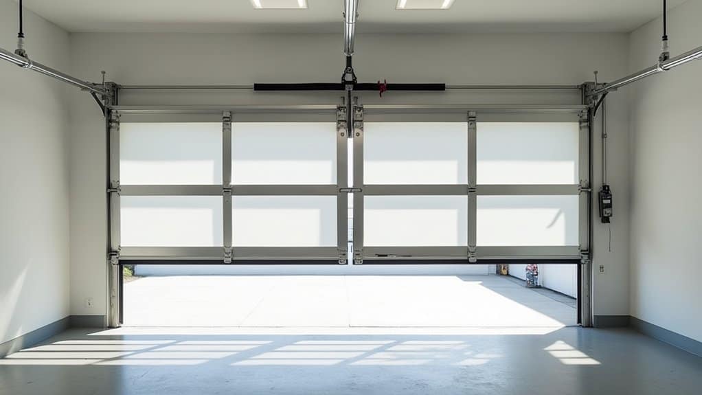 Sliding door panels can be a game-changer for maximizing space in a one-car garage, as they eliminate the need for traditional swinging doors that take up valuable room. Start by measuring the dimensions of the garage opening and selecting sliding door panels that fit seamlessly, guaranteeing they are made from lightweight yet durable materials like aluminum or composite. Install a track system along the top and bottom of the opening, following manufacturer instructions to guarantee smooth operation and secure mounting.
