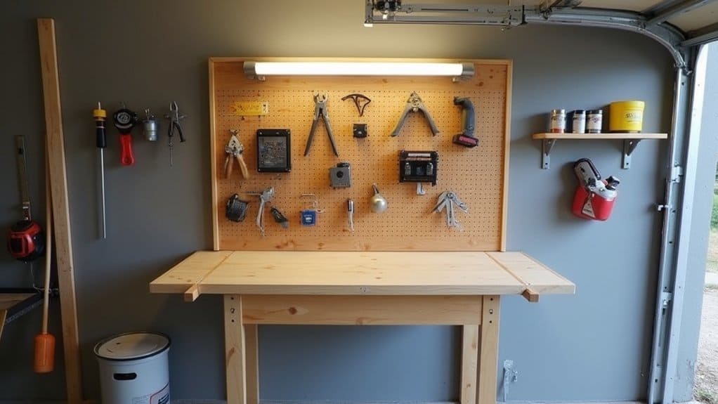 When organizing around the foldable workbench, keep versatility in mind by using nearby wall space for pegboards or shelves to store tools and supplies within arm’s reach. Clear the area beneath the workbench if it folds down, ensuring no items obstruct its movement, and consider adding rolling storage carts that can be moved aside when the bench is in use. This setup allows you to transform the garage back into a parking or storage space effortlessly, maintaining a clutter-free environment.
