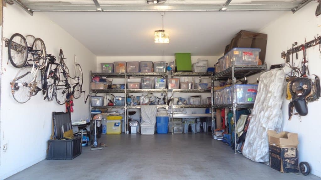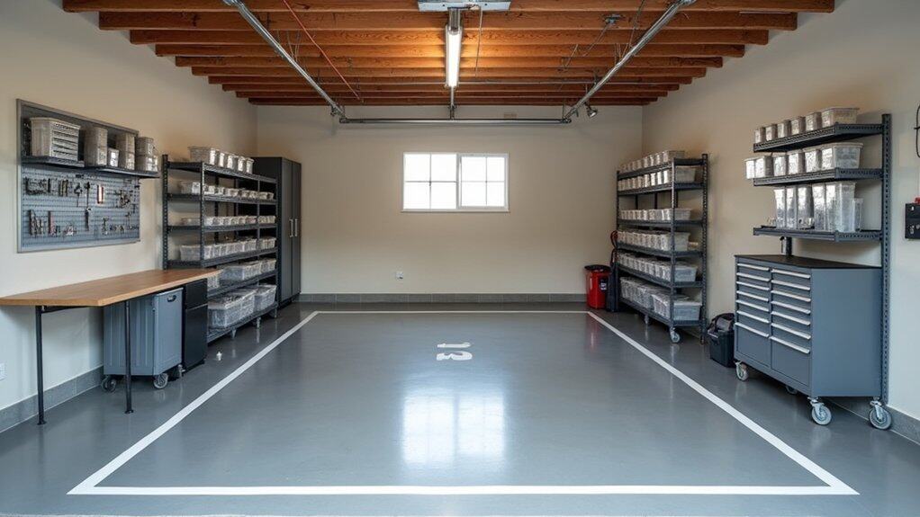To optimize the floor space layout in a one-car garage, start by prioritizing the placement of larger items, such as vehicles or workstations, to guarantee they have ample room for functionality and access. Position the car centrally or to one side if you need space for other purposes, and consider marking the parking area with tape or paint to avoid clutter encroachment. Group similar items, like tools or sports equipment, into designated zones to minimize wasted space and improve accessibility.