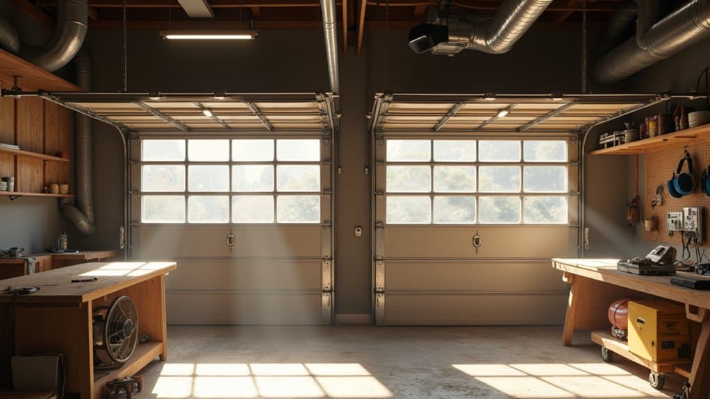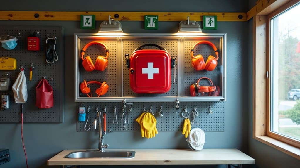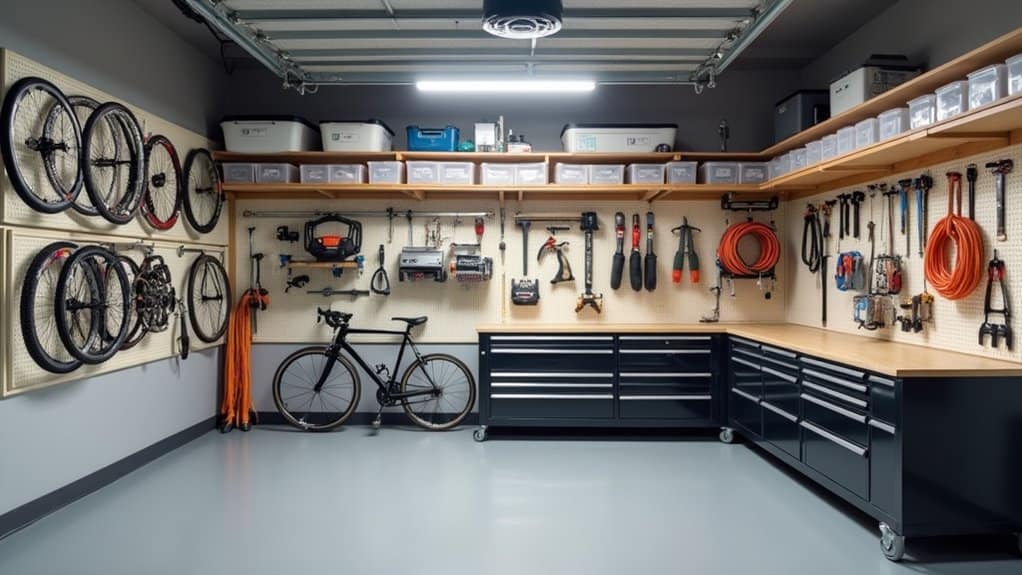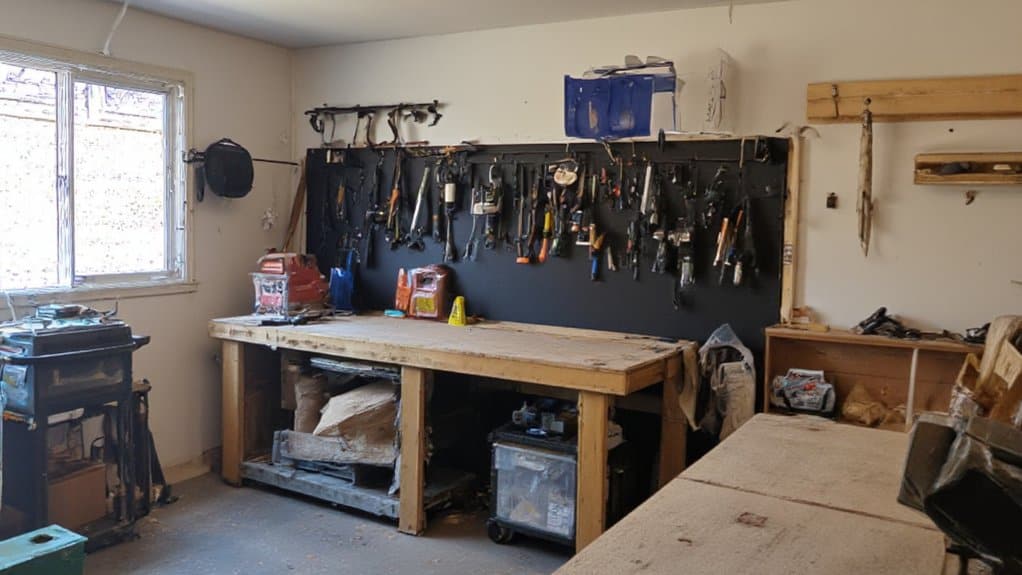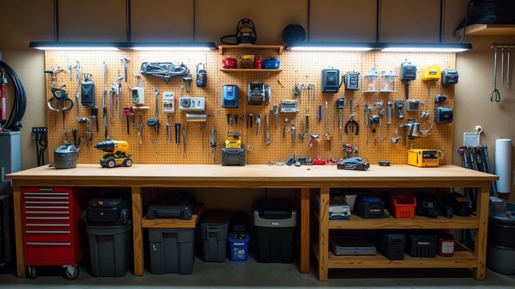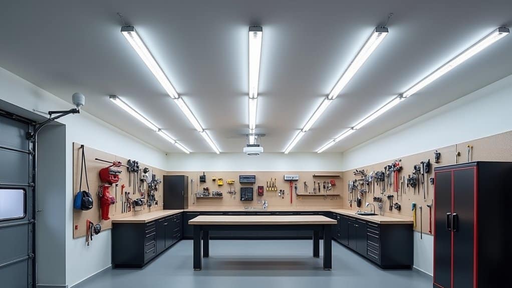 Next, supplement overhead lighting with task-specific fixtures, such as adjustable work lamps or under-cabinet lights, to focus on specific workstations or tool areas. Make sure that light fixtures are positioned to minimize glare and shadows, which can strain your eyes during prolonged projects. For added convenience, consider installing motion-sensor lights near entry points or frequently used areas to save energy and improve accessibility.