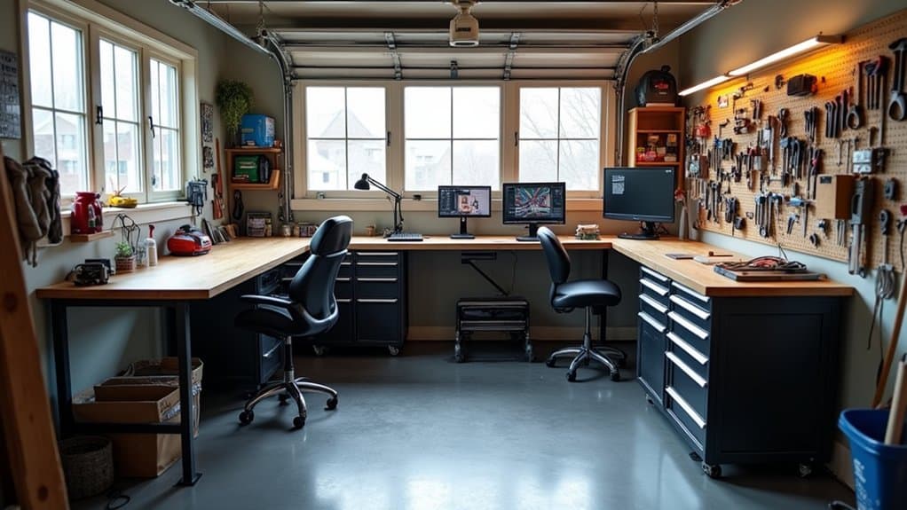 Creating ergonomic workspaces in a garage shop is essential for enhancing productivity and reducing physical strain during long hours of work. Start by setting up adjustable workstations or benches that allow you to maintain a neutral posture, with your elbows at a 90-degree angle while working. Make certain that frequently used tools are within easy reach to minimize unnecessary stretching or bending, and consider installing anti-fatigue mats to reduce stress on your feet and lower back when standing for extended periods.