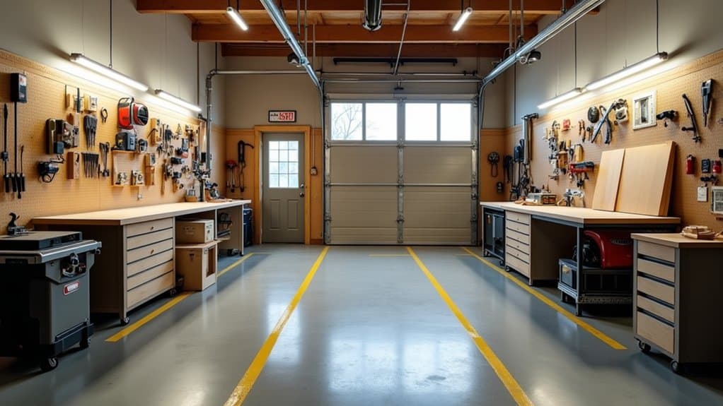 Consider dividing the garage into distinct zones based on tasks, such as a cutting area, assembly space, and storage section, to streamline workflow and minimize cross-contamination of materials. Place larger, stationary equipment like table saws or workbenches against walls to maximize central floor space for projects and movement. Lighting should be strategically positioned over key work areas to reduce shadows, and guarantee adequate ventilation if working with paints or chemicals to maintain a safe environment.