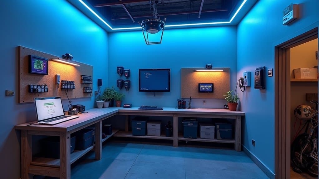 Integrating smart technology into your garage shop setup can greatly enhance efficiency and convenience. Start by installing smart lighting systems that allow you to control brightness and schedules via a smartphone app or voice commands, ensuring ideal visibility for detailed tasks. Additionally, consider smart thermostats to maintain a comfortable working environment by automatically adjusting temperatures based on your usage patterns.
