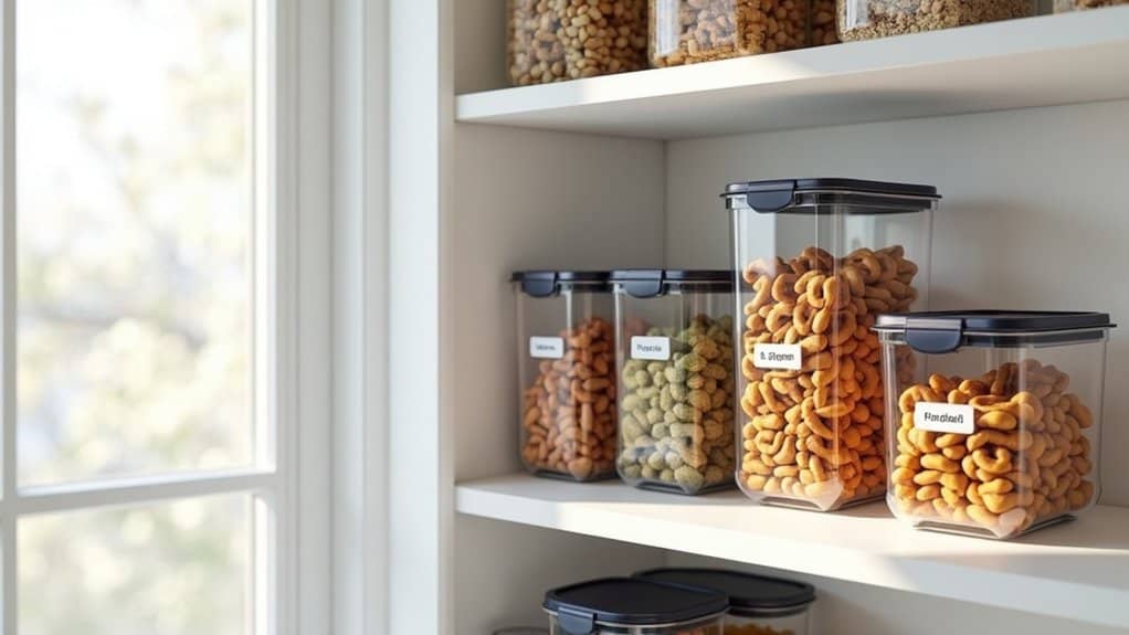 When choosing the right storage containers for your snack pantry, prioritize durability and functionality to keep your items fresh and accessible. Opt for airtight containers to protect snacks like chips, crackers, and nuts from moisture and staleness, guaranteeing they last longer. Clear containers are ideal as they allow you to see contents at a glance, making it easier to track inventory and avoid overbuying. Additionally, consider stackable designs to maximize vertical space in your pantry, creating a neat and efficient layout.