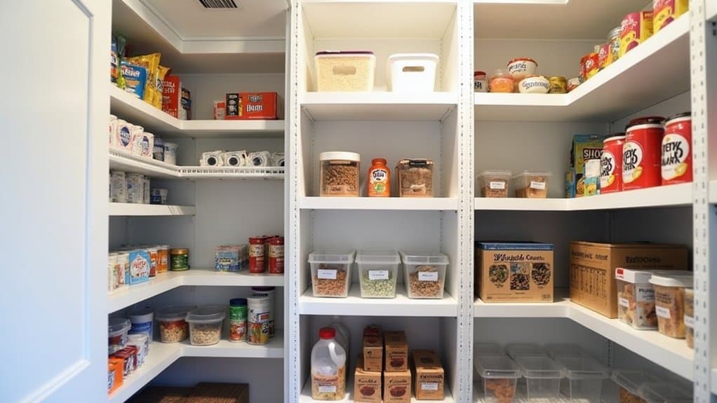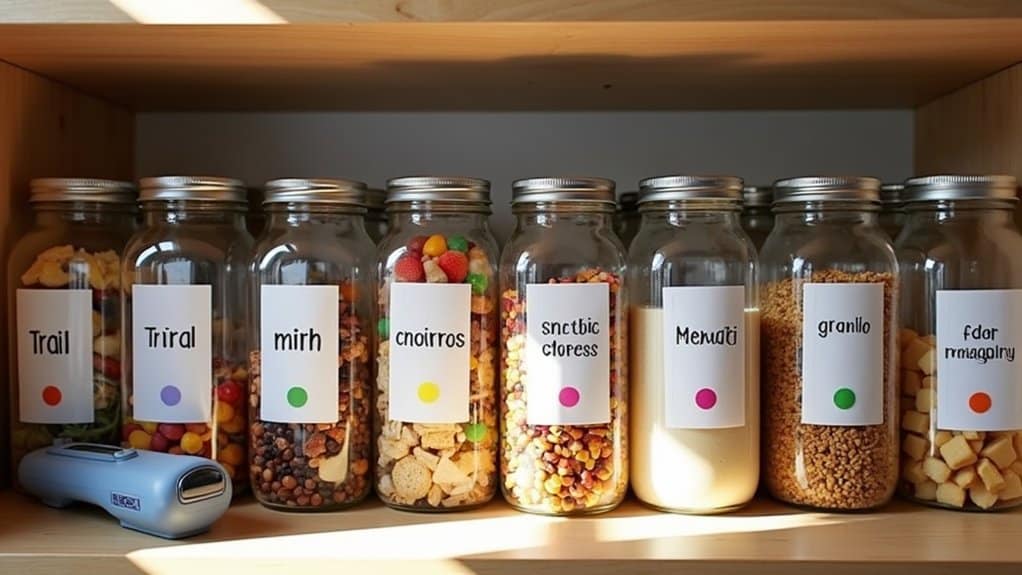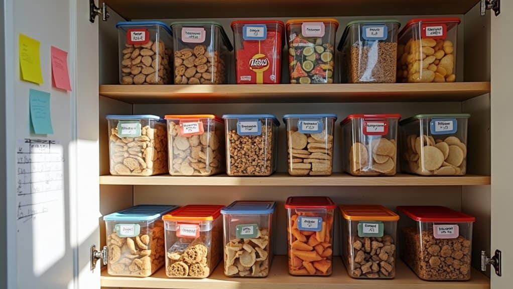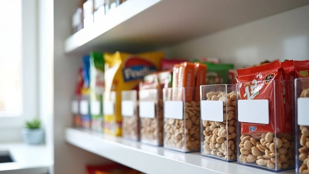 Next, think about the accessibility and convenience of your storage space for all household members. If children or shorter individuals need to reach snacks, prioritize lower shelves or easy-to-access areas for their favorites. For items used less often or meant for specific dietary needs, designate higher or less prominent spots to avoid clutter in prime areas. Also, take note of the storage environment, guaranteeing it’s cool, dry, and away from direct sunlight to preserve snack freshness. This initial assessment will lay the groundwork for a functional and organized snack pantry tailored to your household’s habits and preferences.