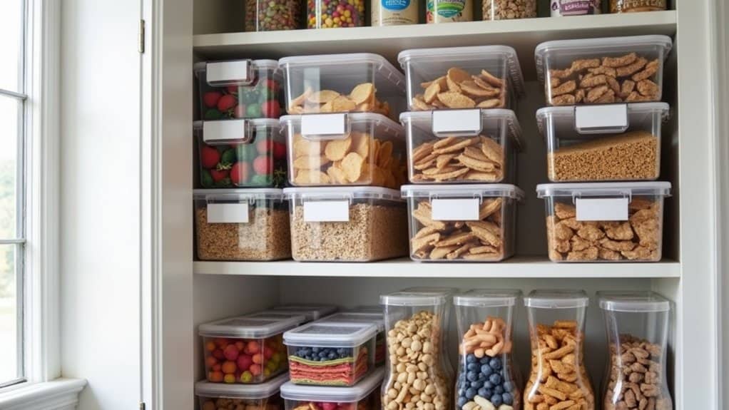Size and shape matter as well, so match containers to the types of snacks you store most often—small bins for individual packs and larger ones for bulk items. Ascertain the containers have easy-to-use lids, especially if children or elderly family members will be accessing them. Label each container with contents or expiration dates using removable labels or a label maker for quick identification. Finally, invest in BPA-free plastic or glass options for safety, and avoid flimsy materials that might crack or warp over time.