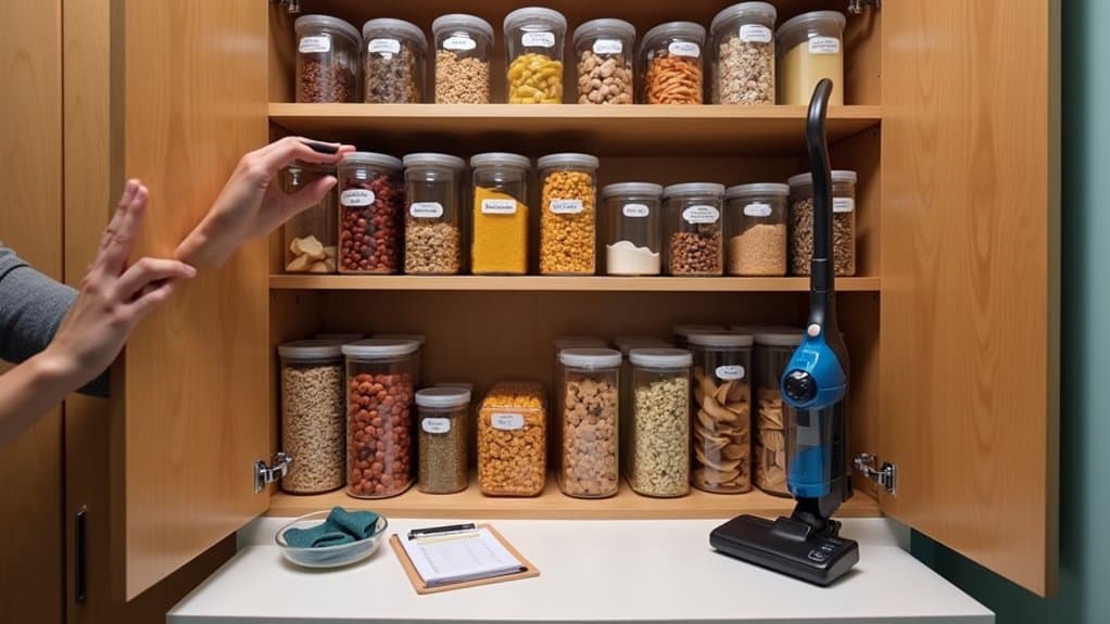 Additionally, involve your household in the upkeep process by assigning simple tasks, like sorting or labeling, to family members or roommates. Clean up spills or crumbs immediately to avoid attracting pests and to maintain a hygienic space. Consider keeping a small inventory list or using a pantry app to track stock levels, which can help streamline grocery shopping. Regular maintenance transforms pantry organization from a chore into a sustainable routine, guaranteeing your snack space remains functional and inviting.