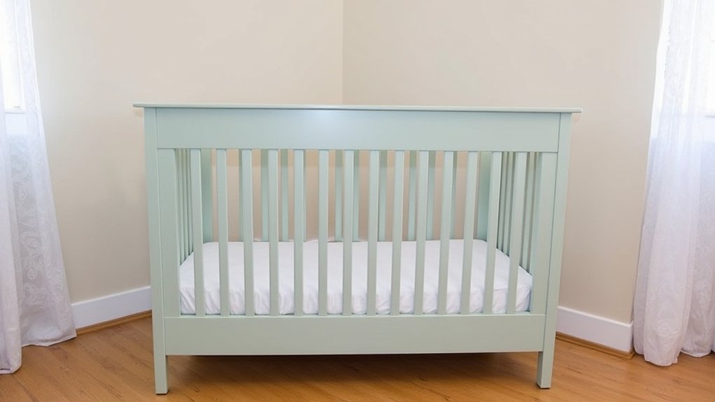 As you build a soothing nursery, consider a subtle sage crib to anchor the space with calming tones. This soft green hue, around 60% saturation, pairs well with whites and creams, creating peace. Pick a crib with dimensions of 52” long by 28” wide for standard mattresses.
