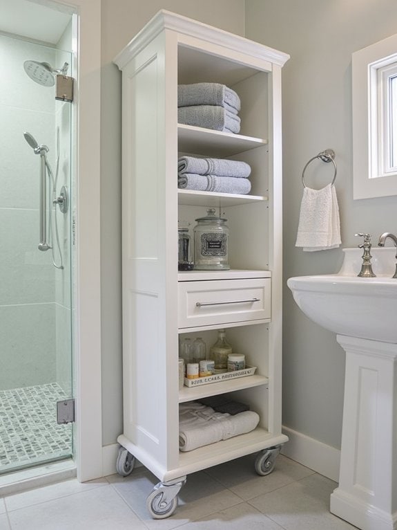A rolling bathroom cabinet provides a mobile storage solution that maximizes limited space. The wheeled design allows you to move essentials where needed and store them away when not in use, making it an adaptable organization tool for any bathroom layout.