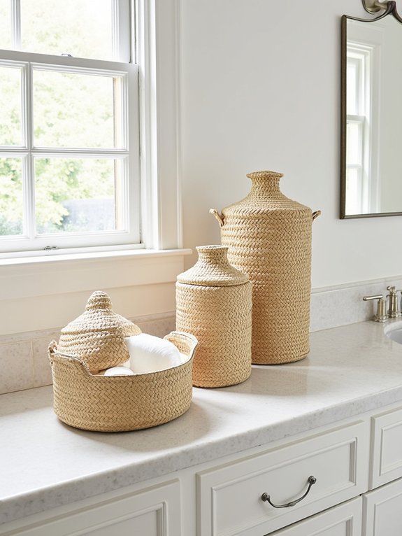 For maximum effectiveness, group similar items together in each basket and attach wooden identification tags. These versatile organizers work well for storing everything from bathroom toiletries and cleaning supplies to extra linens and paper products, while adding natural texture to your space.