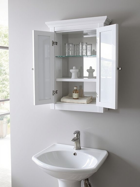 A medicine cabinet mounted above the sink combines storage functionality with a mirror for daily grooming needs. These fixtures come in various styles from classic to contemporary, enhancing both utility and aesthetics while making spaces appear larger through their reflective surfaces.