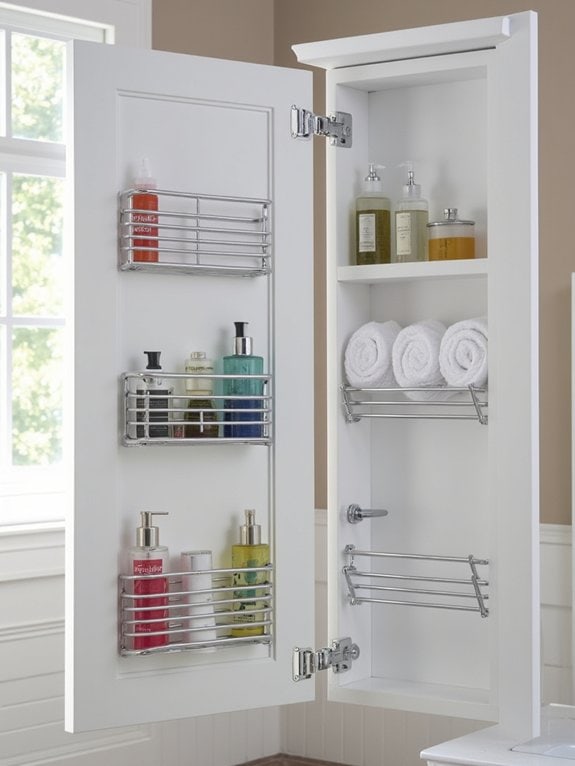 The versatility of door storage allows for multiple organization options. Clear acrylic organizers can hold makeup and skincare products, wire baskets accommodate styling tools, magazine holders store toilet paper rolls, and adhesive hooks keep washcloths and loofahs organized. This approach maximizes space while maintaining a tidy bathroom environment.