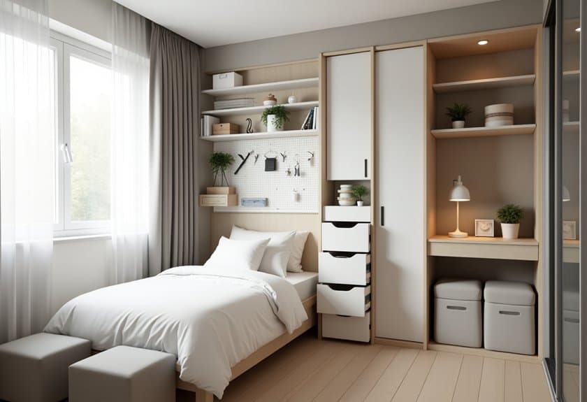 Like a puzzle master solving a complex challenge, you’re about to discover how to transform your cramped bedroom into a masterpiece of efficiency. I’ve spent years perfecting these organization hacks in my own tiny 8×10 space, and now I’m excited to share the secrets that’ll help you maximize every square inch of your room. From genius under-bed solutions to space-saving furniture tricks, these 15 game-changing tips will revolutionize how you think about small-space living.