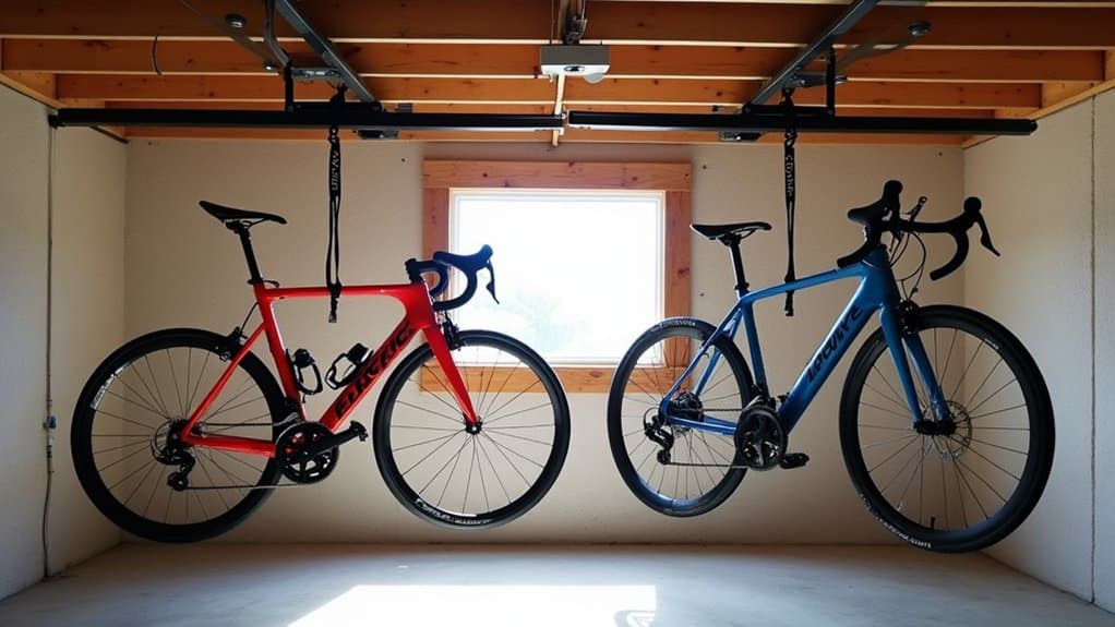 Installing a bike ceiling hoist is an excellent way to save floor space in your garage while keeping your bicycles secure and out of the way. Choose a hoist system with a weight capacity that matches your heaviest bike, guaranteeing it includes sturdy pulleys and ropes for safe operation. Mount the hoist to a ceiling joist or beam for maximum stability, using heavy-duty screws or bolts as recommended by the manufacturer.
