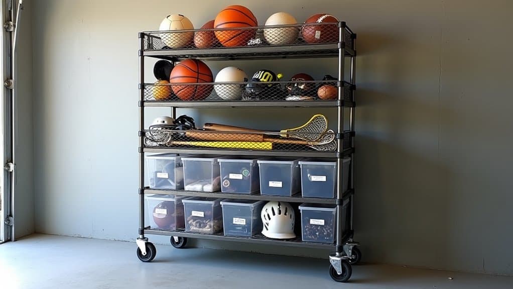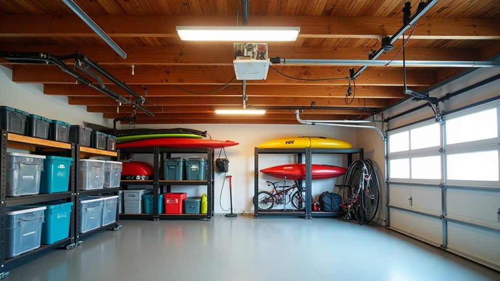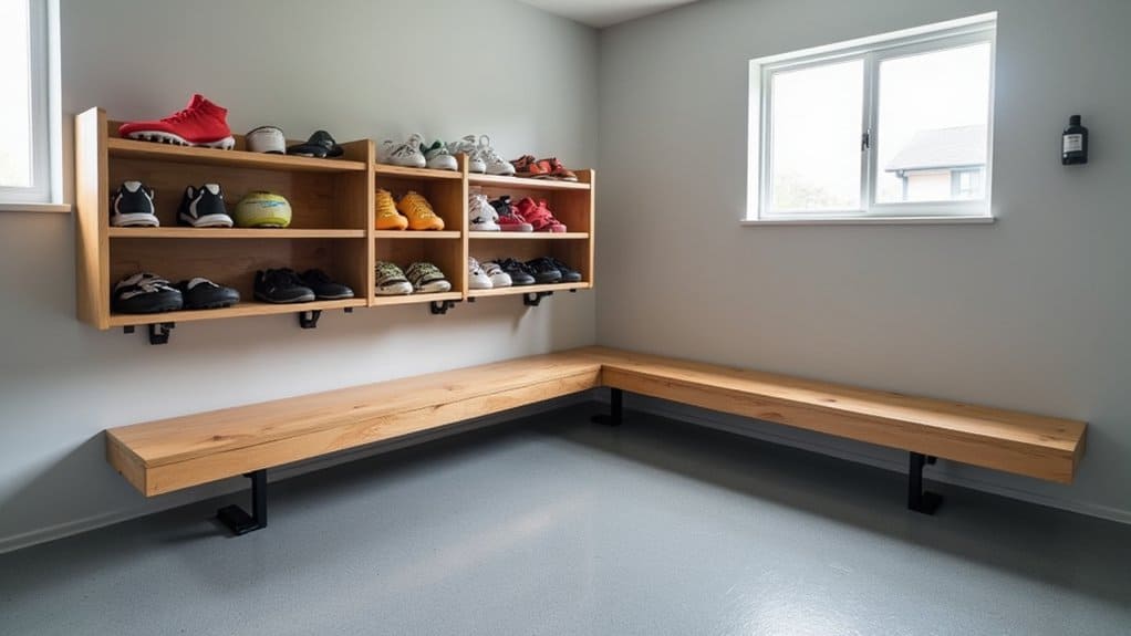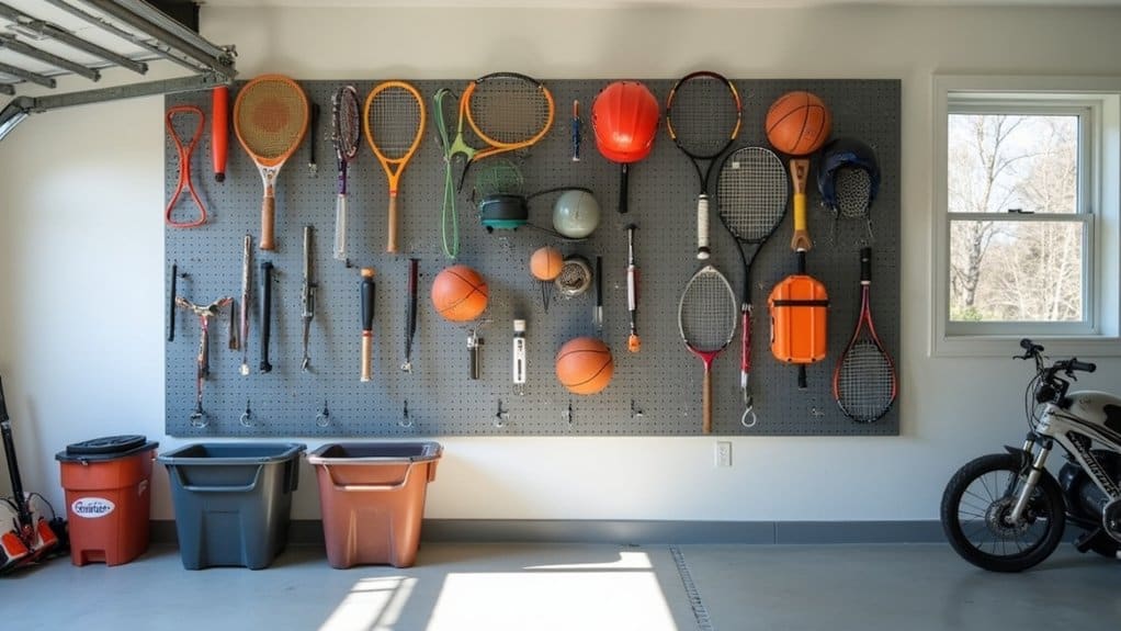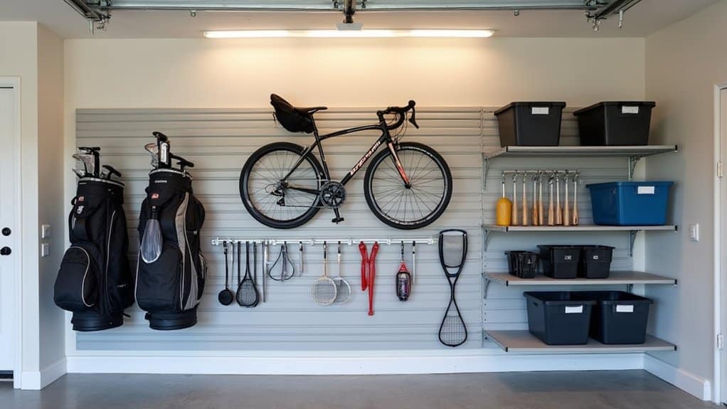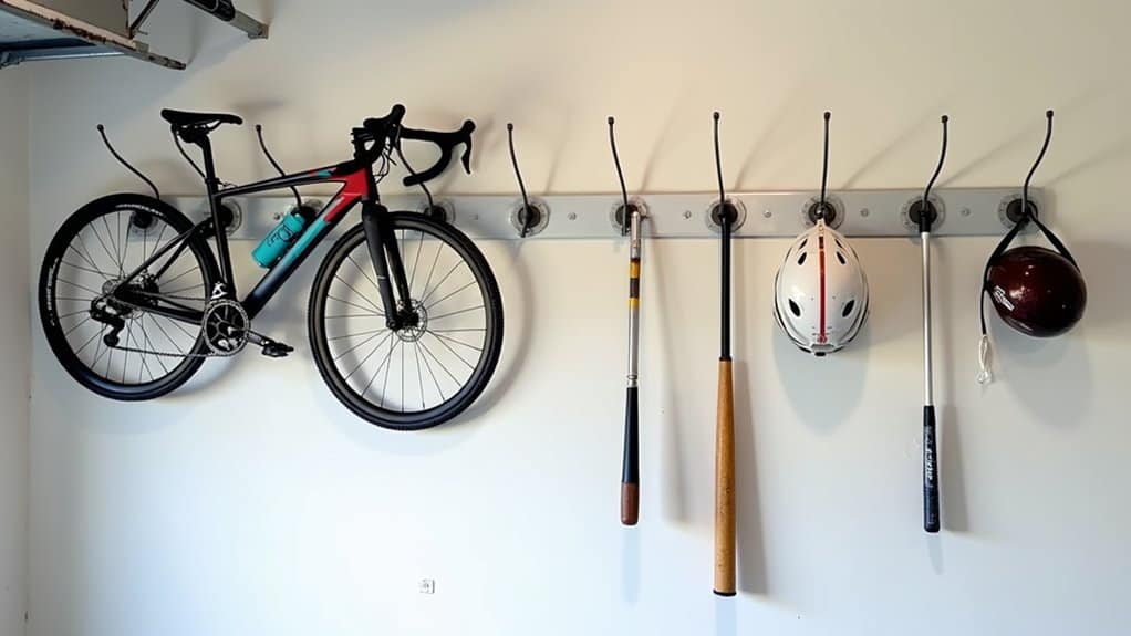 Wall-mounted gear hooks are an excellent solution for keeping sports equipment organized and off the garage floor. Choose sturdy hooks designed to hold the weight of heavier items like bicycles, helmets, or hockey sticks, and guarantee they are made of durable materials like steel or heavy-duty plastic. Install them at varying heights to accommodate different types of gear, making sure to secure them into wall studs for maximum stability.