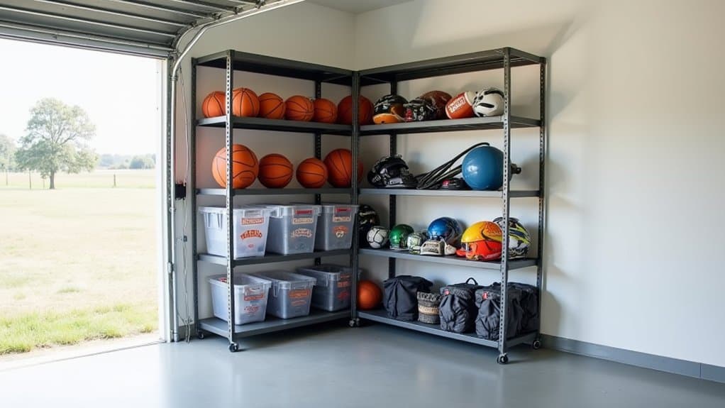 To organize effectively, categorize your sports gear by type or season, placing frequently used items on easily accessible middle shelves and less-used gear on higher or lower ones. Use labeled bins or baskets on the shelves to keep smaller items like gloves, shin guards, or tennis balls contained and easy to find. This system not only keeps your garage tidy but also makes it simple to grab what you need for practice or game day.