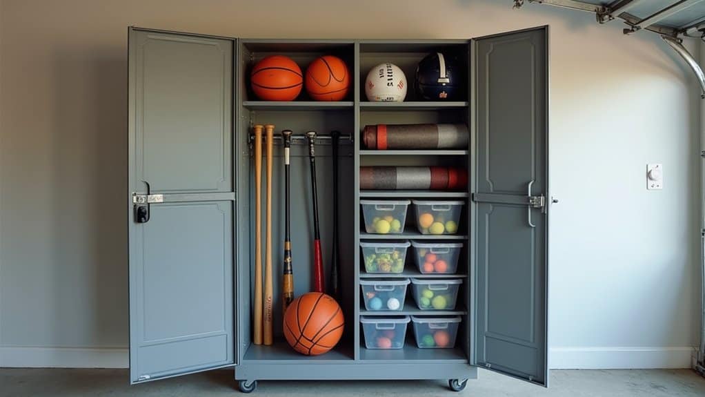 A locking sports equipment cabinet is an excellent solution for keeping your gear secure and organized in the garage. Start by selecting a sturdy cabinet with a reliable locking mechanism, guaranteeing it’s large enough to store items like helmets, balls, and bats. Install the cabinet in a convenient, accessible spot in your garage, preferably near the entrance for easy access during practice or game days.