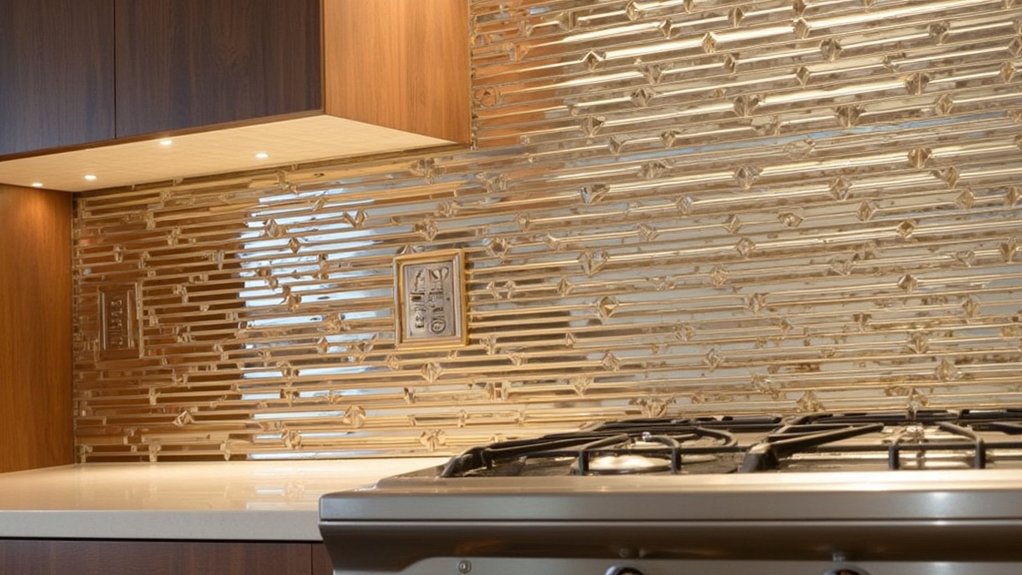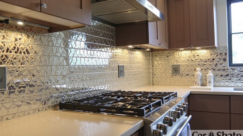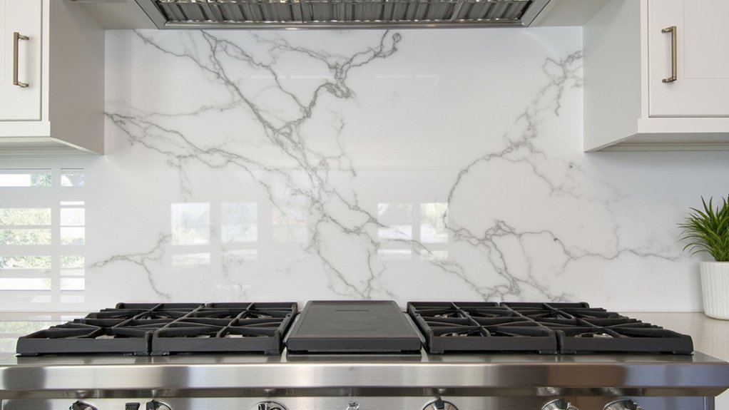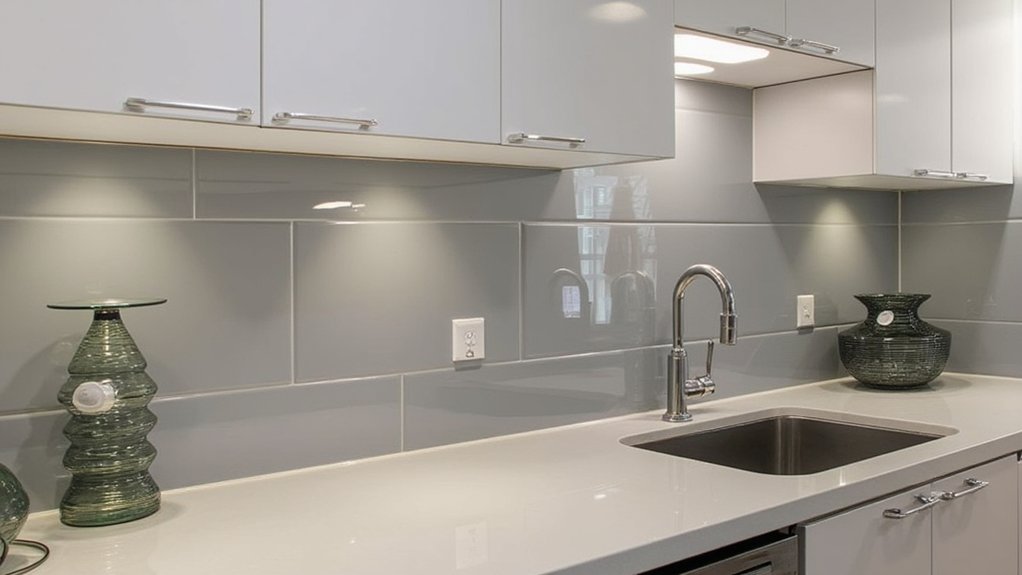 Switching gears to sleek glass panels, you can elevate your kitchen with a modern, polished look that’s easy to maintain. These panels, often 12×36 inches, reflect light and make spaces feel larger. Install them in just a weekend with basic tools.
