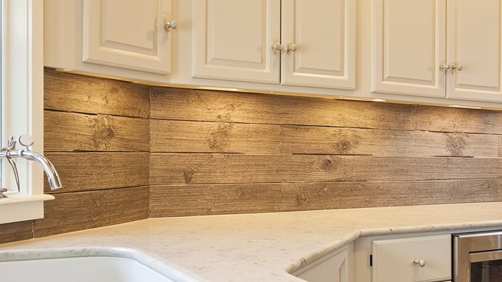 Let’s shift focus to rustic wood planks for a warm, cozy kitchen vibe that’s full of character. Imagine transforming your backsplash with weathered wood, roughly 4×36 inches per plank, for a farmhouse feel. Install them horizontally over a 3×6-foot area in just one weekend.