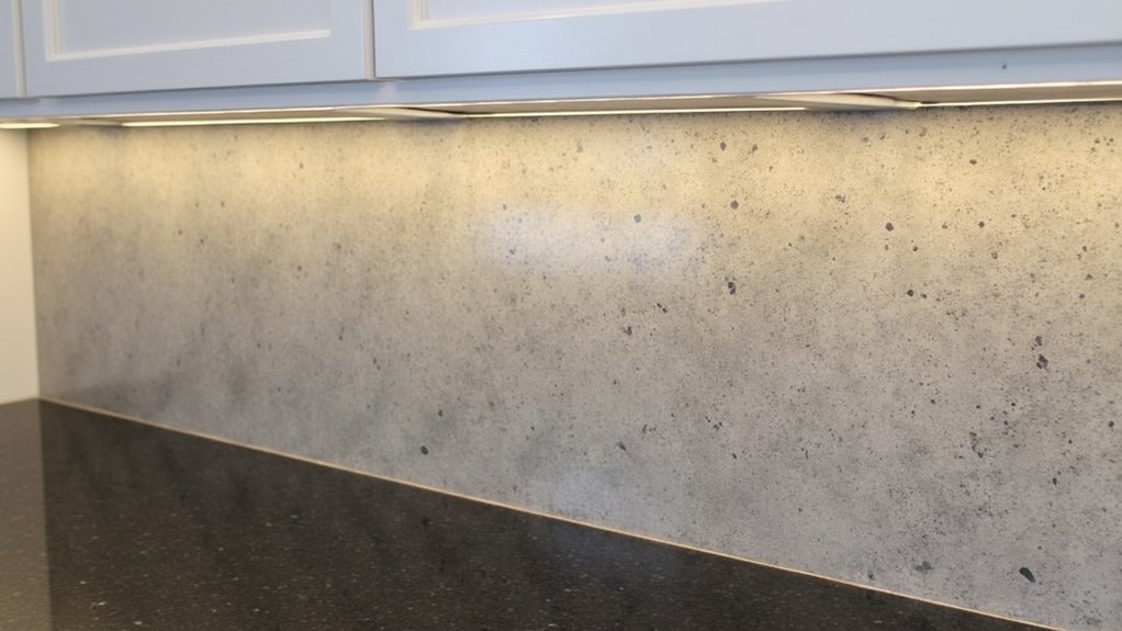 Let’s explore a rugged yet modern vibe with a textured concrete finish for your kitchen backsplash. You’re creating a sleek, durable surface that’s about 18-24 inches high, covering the wall behind your sink or stove. It takes about 48 hours to set fully.